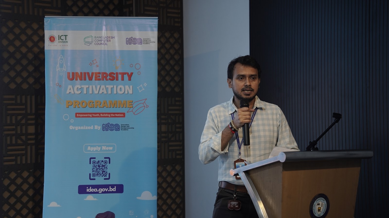 The session began at 11:30 AM with welcoming remarks from Mr. Abhijit Bhowmik, Associate Professor and Special Assistant of the Office of Student Affairs (OSA), Department of Computer Science, AIUB who thanked the ICT Ministry and the iDEA Project for their support. He explained that although the project offers great opportunities for fresh graduates, many are still unaware of it. He encouraged students to focus on proper documentation and learn what employers really expect. After him, Dr. Khandakar Tabin Hasan, Professor and Head of Graduate Program, Department of Computer Science, AIUB highlighted the importance of guidance. He reminded students that no idea is “silly” and encouraged them to seek help from faculty members whenever needed.