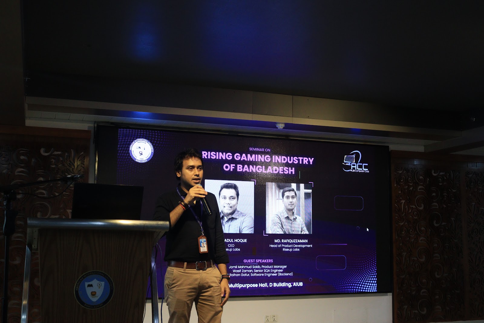 A seminar titled “Rising Gaming Industry in Bangladesh” was stationed by Riseup Labs in association with AIUB Computer Club (ACC) on Monday, June 12, 2023, at the Multipurpose Hall (D – Building) of American International University-Bangladesh. The most anticipated guests Mr. Ershadul Hoque, Founder & CEO of Riseup Labs, Md. Rafiquzzaman, Head of Product Development of Riseup Labs, Mr. Jamil Mahmud, Product Manager of Riseup Labs, Mr. Wasif Zaman, Senior SQA Engineer of Riseup Labs, Mr. S. M. Raihan Gafur, Software Engineer (Node.js) of Riseup Labs were present in the seminar. Mr. Abhijit Bhowmik, Associate Professor and Special Assistant of the Office of Student Affairs (OSA) was also present among others. The hosts of the session were Ms. Tunaj Ahmed and Mr. Shohan Morol, General Members of AIUB Computer Club.